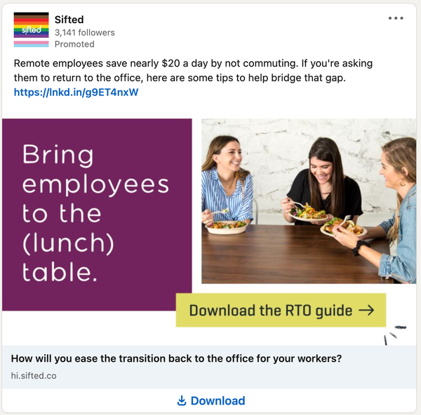 Social Media Examples • June 27 2023 Sifted LinkedIn Ad (June 23, 2023) LinkedIn Ad ("Bring Employees to the (Lunch) Table")
