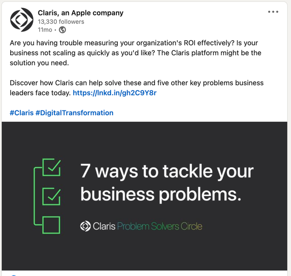 Social Media Examples • June 27 2023 Claris LinkedIn Ad (July 22, 2022) Claris LinkedIn Ad ("7 Ways to tackle your business problems.)