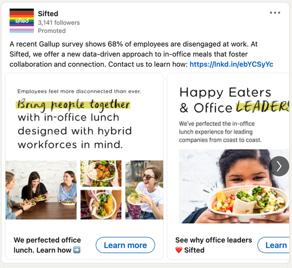 Social Media Examples • June 27 2023 Sifted LinkedIn Ad (April 23, 2023) LinkedIn Ad (In-Office Lunch)