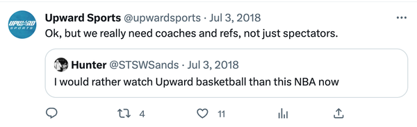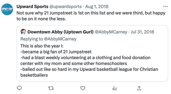 Social Media Examples • June 27 2023 Upward Sports Twitter (21 Jumpstreet response) Upward Sports Twitter post (August 1, 2018)