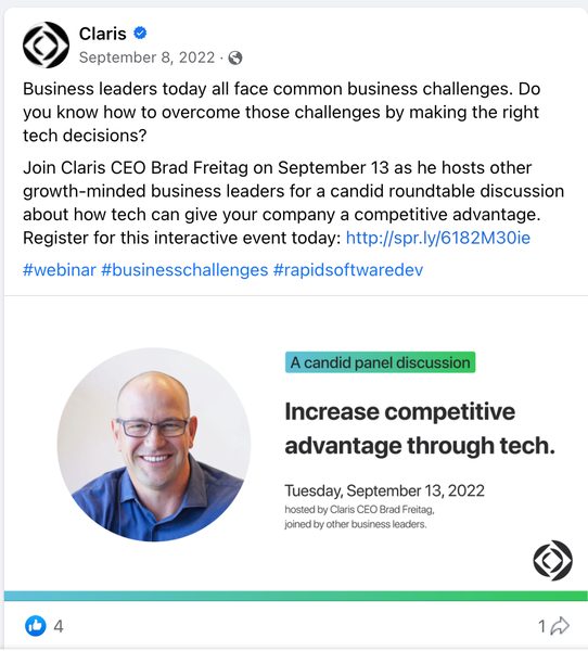 Social Media Examples • June 27 2023 Claris Facebook Post (September 8, 2022) Claris Facebook Post (Increase competitive advantage through tech.)