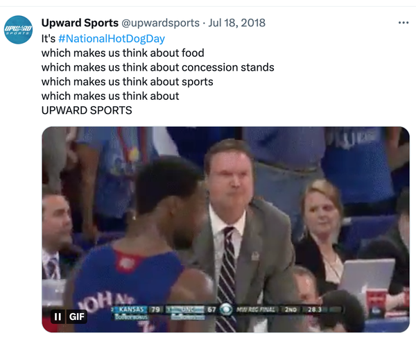 Social Media Examples • June 27 2023 Upward Sports Twitter (National Hot Dog Day) Upward Sports Twitter Post (July 18, 2018)