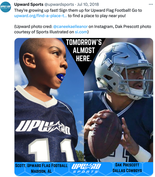 Social Media Examples • June 27 2023 Upward Sports Twitter Post (Dallas Cowboys) Upward Sports Twitter (July 10, 2018)